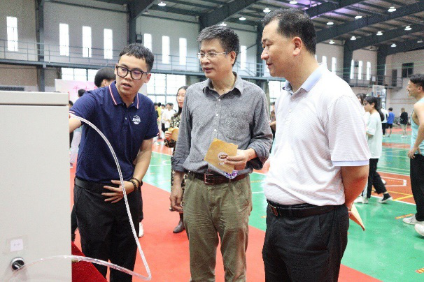 环境工程创业团队“福建省晤净环保科技有限公司”自主研发的小型污水处理设备尤为亮眼。该设备以“AO+MBR生化处理”为核心技术,形成了“掌上智能监测-自动加药预处理-高效生化流程-创新深度处理-水渣场区回用”五位一体的养殖粪污近零排放处理体系。该项目已在多家养殖企业应用。团队成员展示了将黑色墨水加入设备中,即时净化清澈透明的过程。