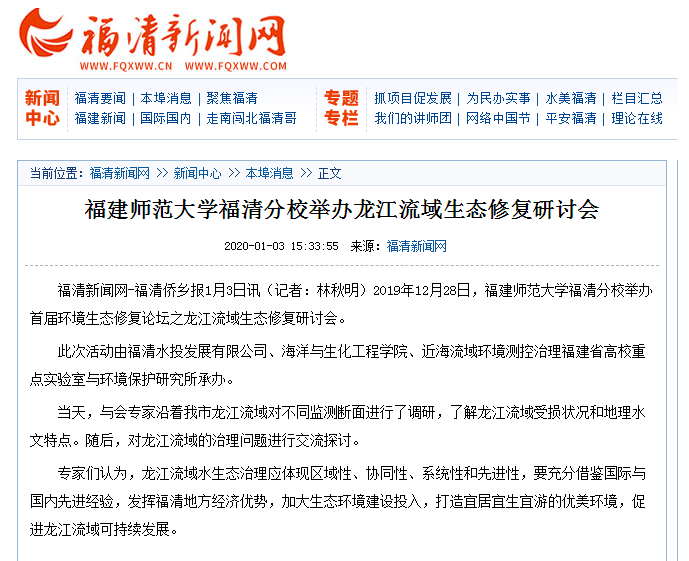 2020年1月3日的福清新闻网报道了我校举办首届环境生态修复论坛之龙江流域生态修复研讨会新闻。