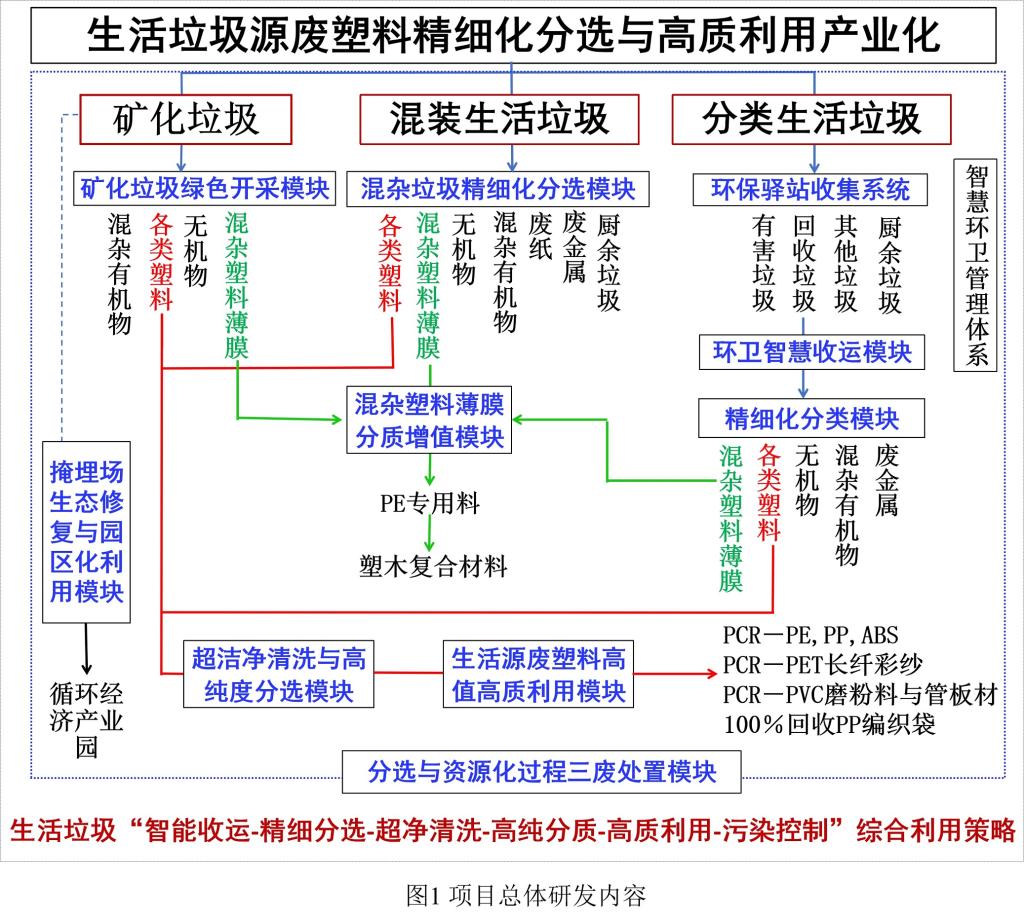 2010年以来,在国家工信部、省科技厅的大力资助下,针对废塑料产业共生协同增值机制不明确、环卫系统与再生系统不匹配、生活垃圾分选精细化程度低、混杂塑料薄膜分离困难、生活源废塑料老化严重和PCR(消费后再生)塑料气味重等问题,重点实验室联合福建师范大学及福龙马集团股份有限公司、厦门陆海环保股份有限公司、江苏金发环保科技有限公司、福建省百川资源再生科技股份有限公司、深圳市旭景力博环保科技有限公司、张家港联冠环保科技有限公司多家企业围绕精细分选、超净清洗、分质增值、改性提质等关键技术展开系统研发。项目研发的生活垃圾智能收运、废塑料加工尾气油水分离等装备实现了产业化,建立了生活垃圾精细化分选、可回收物(废塑料)精细化分类、生活源废塑料超净清洗高纯分选、生活源塑料(PE、PP、ABS)再生与高质利用、PCR-PET无水着色再生彩纱、一体化回收PVC磨粉与管材、一步法生产100%PCR-PP编织袋、生活源聚烯烃基塑木复合材料等8个类型产业化基地,新增产值46.2亿元,经济、社会、环保效益显著。