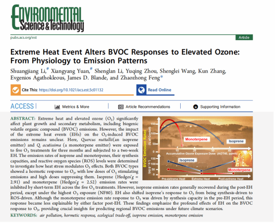 近日,我校海洋学院李双江博士在极端高温事件和臭氧(O3)污染的生态效应研究方面取得重要进展,研究结果以“Extreme heat event alters BVOC responses to elevated ozone: from physiology to emission patterns”为题发表于Environmental Science & Technology上。该研究结果发现极端高温事件会显著抑制植物源挥发性有机化合物(BVOCs)的排放,而非传统意义上BVOCs排放随温度的升高而增加,并强调了极端高温事件对BVOCs响应O3机制的深远影响,为预测未来气候情景下区域BVOCs排放,以及空气污染的精细化治理提供了重要科学依据。